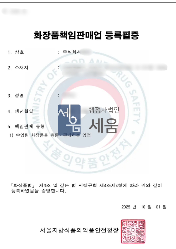 화장품책임판매업 등록 절차를 앞두고 행정적인 도움을 요청하셨습니다.