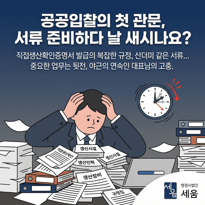 공공기관이나 지자체의 굵직한 행사 입찰 공고를 보고 가슴이 뛰었지만, ‘직접생산확인증명서 제출 필수’라는 자격 요건에 가로막혀 아쉬운 발걸음을 돌리신 적 있으신가요?