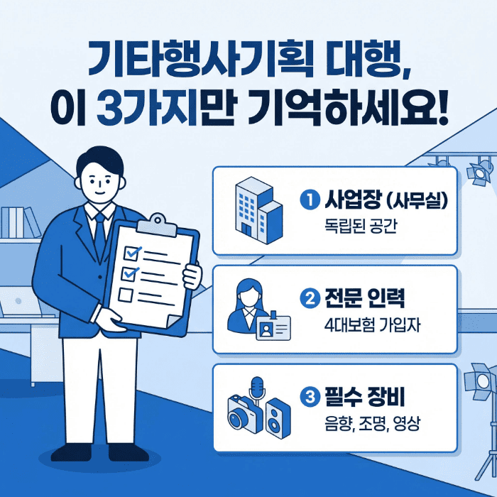 대표님, 서류와 씨름하며 밤새우지 마세요. 행사 기획은 대표님이 제일 잘하십니다. 복잡한 행정 서류와 깐깐한 규정 해석은 행정 전문가에게 맡기시고, 대표님은 성공적인 행사 기획과 영업에만 집중하세요.
